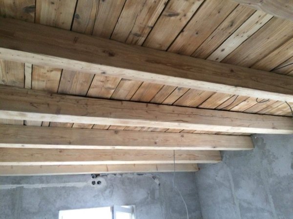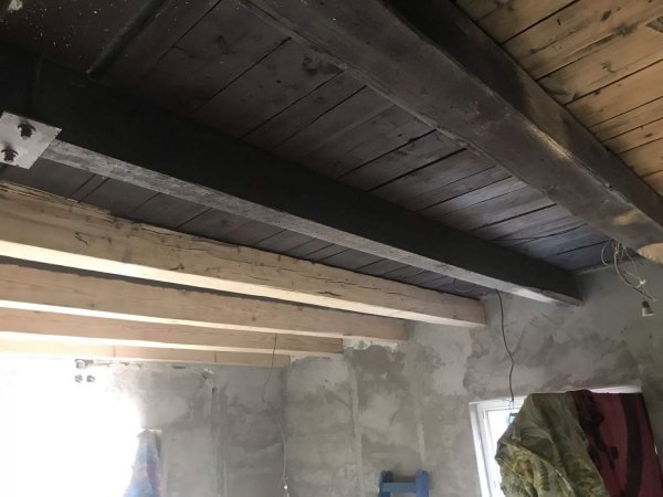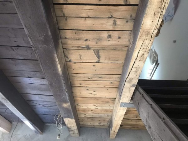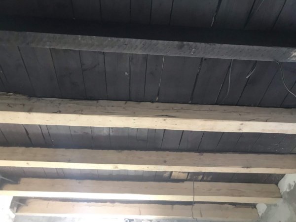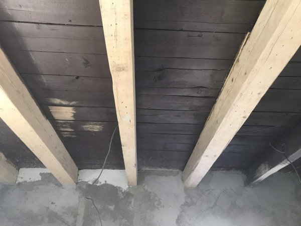 Tryskání dřevěného stropu od starého laku v interiéru domu v Černošicích.